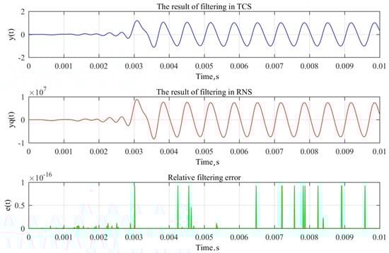 Figure 7 shows that the output signals of positional and RNS filters were almost identical. The error, calculated as a difference between outputs, was about 10−14. This error tends to reduce while the bit depth of RNS filters increases, therefore, it was possible to construct more efficient signal processing devices on low-precision electronics or to increase the performance of existing solutions by changing to the residue field algebra.