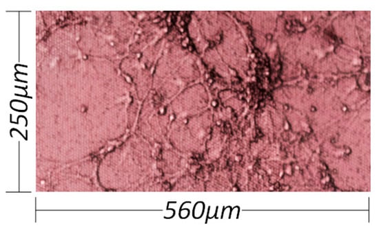 A top-view microscope image of the neuronal cells culture is shown in Figure 3. After dissociation from the tissue, the hippocampal neurons in culture are able to reconstruct a vital network with specific connections, thus being useful in validating the performance of devices for electrophysiological signal detection.