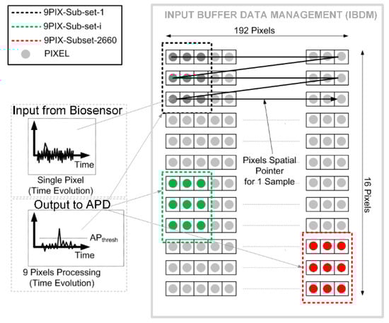The signal is encoded in a digital word of 14 bits. σNOISE,j2 is the calculated noise power over the 3 × 3 matrix. Therefore, to separate the eventual AP spike from noise, the algorithm takes nine-pixel sub-set (9PIX-Sub-set as indicated in Figure 5).