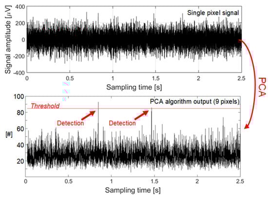 Thus, it is now more reliable to apply a threshold crossing approach (threshold value is placed at 84.6) and to detect two AP events at 1.9 s and 2.2 s. On average, when no AP occurs, the signal RMS power for each pixel will be equal to σNOISE,j. Therefore, on average will be equal to 1, and the combined 27-samples value will be 27. The AP detection condition implies that an AP is detected when the PCA output signal (Figure 6) is higher than 84.6. This leads to a minimum SNR value of at least 7 dB (2).