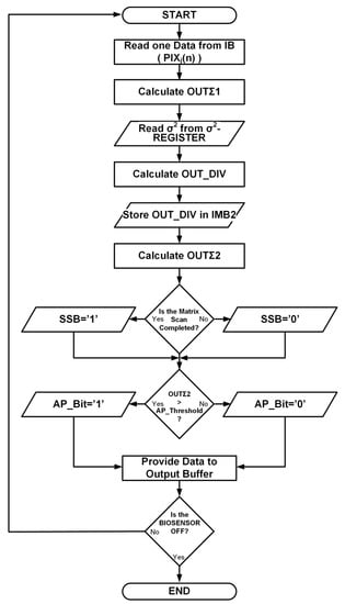 Each time a new data (PIXj(n), is received from the MEA, the APD executes the operations illustrated in the flowchart. The algorithm starts reading the input data up to providing an output data. Output data encodes whether an AP has been detected in the n-th timeframe (time pointer) and in the j-th pixel (spatial pointer).
