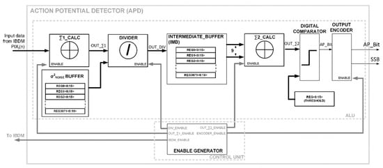 The ALU consists of arithmetic, logic, and memory blocks that perform the operations given in Equations (4)–(7). Input data are encoded as signed 14-bit integers, but thanks to their limited dynamic range (cantered around zero and with maximum values around 150–200), can be re-coded with nine-bit resolution (−256 to 255) to limit the hardware requirement without introducing any error. The operations are then performed with unsigned integer arithmetic since after calculating the square value in Σ1_CALC all the values become positive. After each block of the ALU, data are again re-coded to be represented with the minimum resolution compatible with their dynamic range, thus minimizing hardware requirements. The only operation that introduces computational errors while performed with integers is the division, implemented with a Radix-2 algorithm and neglecting the reminder. To minimize this error to below 1%, the numerator (OUT_ Σ1) has been multiplied by 256 by left-shifting before performing the division. The 256-fold increase in the OUT_DIV value has then been compensated by increasing the AP_Threshold value by 256 as well. The CU regulates the behavior of the ALU using specific enable signals and spatial pointers. The enable signals sequentially activate the stages of the ALU, controlling the evolution of the algorithm. The time evolution of the CU output signals is illustrated in Figure 11. When the IBDM_ENABLE signal is high, new data is read from the input buffer in IBDM.