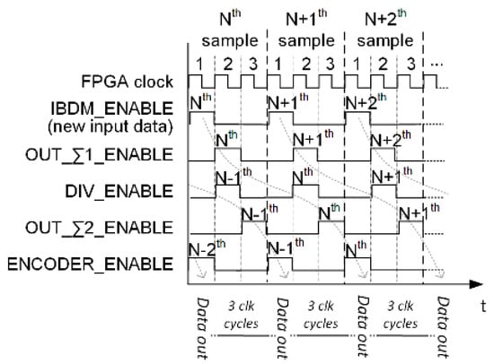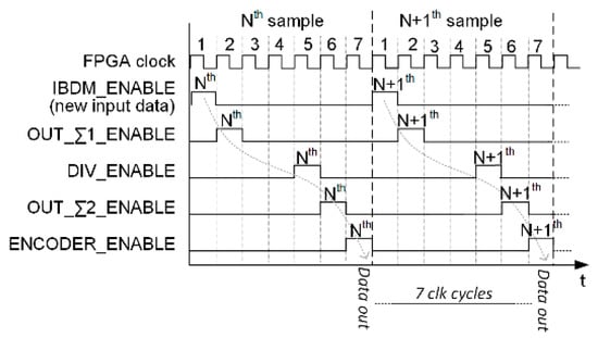 Thus, these operations can be executed in parallel, saving time and reducing clock frequency. In fact, when a certain sample (N-th sample in Figure 11 and Figure 12) is processed by a specific stage (Σ1_CALC, DIVIDER, etc.) then such stage waits for six clock cycles for the next data ((N + 1)-th) without performing an operation and practically entering in stand-by mode.