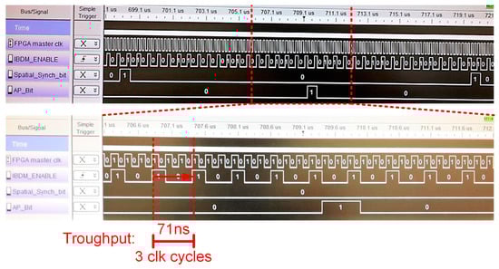 Figure 9 shows the AP_Bit and the SSB time evolution extracted from the FPGA output pins using Agilent 16821A logic analyzer []. The input pattern signals have been directly taken from the experimental setup in Figure 1.