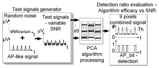 MEAs are characterized by high spatial and temporal resolution that can be exploited by correlation algorithms such as principal component analysis (PCA) []. The pixel density and the sample frequency are sufficiently high that a single AP deterministic event can be detected by nine adjacent pixels for three consecutive time samples (3 × 3 pixel square, see 9PIX-Sub-Set in Figure 5).