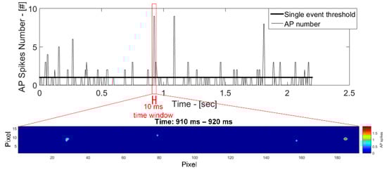 The AP_Bit can be used to detect whether any synchronous activity of the neuron population is happening at any given moment. Simultaneous spiking by multiple neurons could hint at particular medical conditions such as the beginning of an epilepsy seizure. In order to produce strong synchronous behaviours in cell cultures, external chemical/electrical stimulations are usually required [,]. However, for this experiment no external stimulus has been provided, and therefore only minor synchronicity levels have been observed. More precisely, by counting the total APs detected over 10 ms time-windows, few points over MEA area have shown at some point some (casual/random) synchronous spiking. Figure 17 shows the total number of synchronous spikes referred to the whole MEA during a 10 ms time window. It is possible to observe that some pixels have disclosed some synchronous spiking, for example between 910 ms and 920 ms a total of four areas on the MEA produced some APs. The correspondent spatial map for this particular bursting event is also shown in the bottom part of the same Figure 17. This demonstrates the capability of the proposed system to operate in complex cultures where a more pervasive synchronous activity is imposed. In fact, the NSDD minimizes the data volume produced by the MEA by efficiently encoding only the relevant information about actual neuron activity. This greatly simplifies the real-time implementation of subsequent higher-level algorithms such as AP bursting detection or, more generally, algorithms that can detect neural patterns and abnormal neural activity (i.e., epileptic seizures).