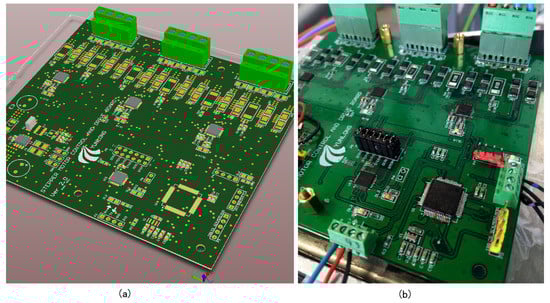 Stepper motor control and drive board: (a) 3D view of the board in PCB design software; and (b) photo of the real board.