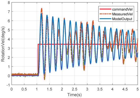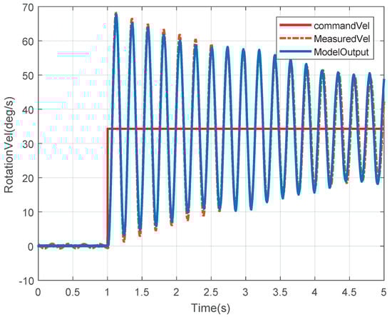 From the experimental data, and can be obtained through one of those numerical optimization methods, such as gradient descent methods or Gauss–Newton methods. The identification results are and rad/s. The output of the model in Equation (18) is compared with the experimental data, as shown in Figure 7, which verifies the correctness of the model.