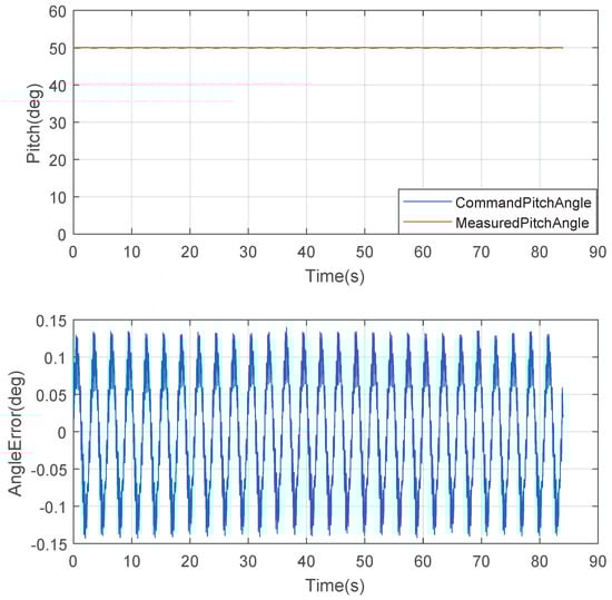 With this input, the controller performance can be seen in Figure 16. In the upper part of Figure 16, the angle error between command (50 deg) and the measurement is shown. In this figure, it can be seen that, at the beginning, the angle error is relatively large, but the error quickly converges and reaches a stable state after around 10 s. The angle error in the stable state (after 20 s) is shown in the bottom part of Figure 16 to show more details, from which it can be seen that the angle error is less than deg.