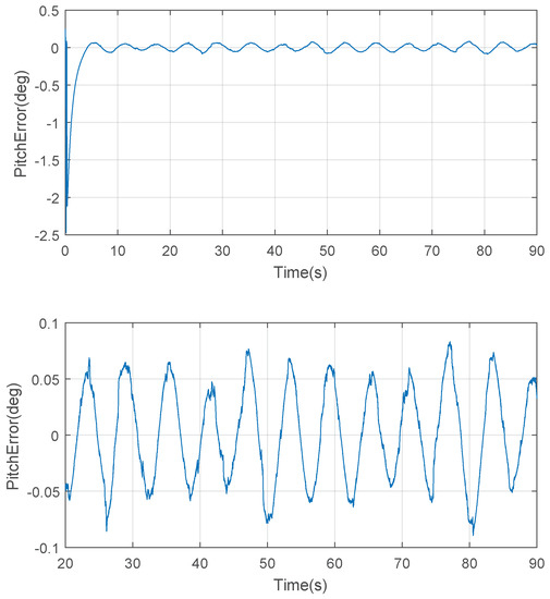 Note that the controller designed above is actually only one of the two controllers for this system. In the current stage, when the MSTA is started, a normal Proportional-Integral-Derivative (PID) controller is firstly applied to adjust the antenna dish to the command attitude, and then the controller in this paper is switched on, which means the angle error is actually very small when the controller in this paper starts working. In addition, note that the data shown in Figure 13 and Figure 14 are sampled when the system has already reached the stable state, which is why we cannot see the transient stage at the beginning of these figures.