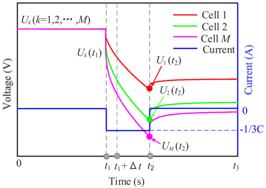 Assuming that a large number of retired cells with unknown capacity and internal resistance need to be quickly screened for capacity and internal resistance, the following screening processes were developed. First, a large number (N) of cells were selected for charging with constant current and constant voltage (CC-CV), and 100% SOC and the same OCV of each cell were obtained. Then, M cells (M <= N) were selected for series constant-current discharging. Figure 1 shows the discharging curve of M cells in the serial-discharging process. The voltage of each cell remained unchanged in the rest stage between 0 and t1. During t1 to t2, cells in a series were discharged with a constant current (1/3 C). In the discharge process, the terminal voltage of each cell continued to decrease, and the quantity of electricity also decreased. The voltage of each cell rose gradually between t2 and t3. Therefore, the voltage curves of N cells from 0 to t3 were obtained. Obviously, the terminal voltage of each cell was affected by the internal resistance during the discharging process. Finally, the residual voltage after excluding the influence of internal resistance could be described as follows:
