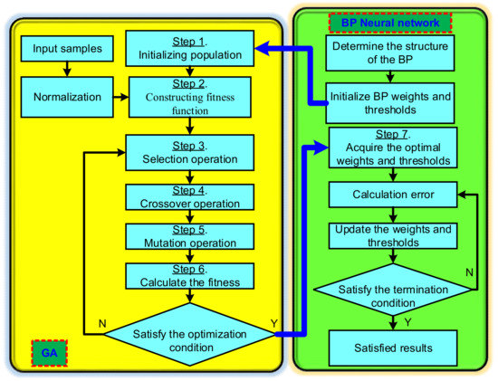 Step 7. Updating weights and thresholds of the neural network obtained by GA: In this three-layer BP neural network, the number of the hidden layer node was 4, the learning rate was 0.1, the number of the iteration was 100, and a sigmoid function was used for the node transfer function. The detailed descriptions about BP neural network are not listed here for brevity, but can be found in References [26,27,28].