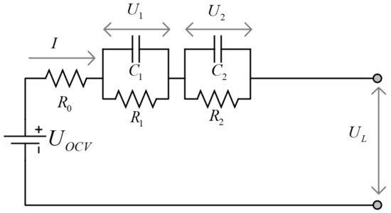 In this study, we implemented a second-order resistor-capacitor (2RC) model to simulate the dynamic characteristics of the LIB [5]. As shown in Figure 3, is the equivalent Ohmic resistance, is the voltage source, and are the diffusion resistances, and and are diffusion capacitances. The terminal voltages of the two series-connected RC circuits are denoted by and , the current is denoted by I, and the terminal voltage is denoted by . Based on the circuit principle, the discretization equations of the 2RC model could be expressed as: