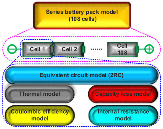 Figure 4 shows the basic structure of the simulation model. The established model included the 2RC model, the thermal model, the capacity loss model, the coulomb efficiency model, and the internal resistance model. These models are described as follows.