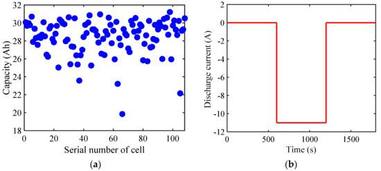 The series battery pack system (108 cells) model was established based on the above models using MATLAB. The model could be used to simulate and verify our proposed screening method. In this simulation, the simulation parameters were set as follows: The initial temperature was set to 25 °C, the initial SOC of each cell was set to 100%, the capacity of the 108 cells was randomly distributed (as shown in Figure 5a), the series constant current discharge was 11 A, and the discharge time was 10 min, as shown in Figure 5b.