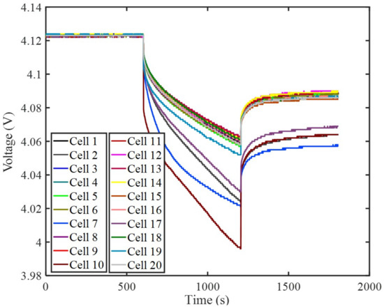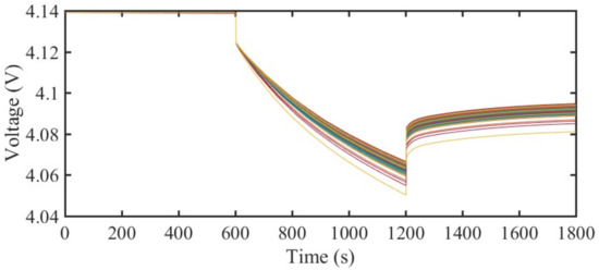 In this simulation, 108 cells were first rested for 10 min, then discharged for 10 min at 1/3 C, and then rested for 10 min after discharge stopped. The voltage curves of 108 cells in the discharge process are shown in Figure 6.
