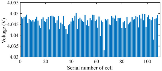As shown in Figure 6, the voltage of each cell remained unchanged during the rest stage (t = 0–600 s), and the voltage of each cell decreased and differentiated during the constant current discharge stage (t = 601–1200 s). At the rest stage after constant current discharge (t = 1201–1800 s), the voltage of each cell gradually increased and tended to be stable. The internal resistance and capacity of the 108 cells were screened using the above simulation results.