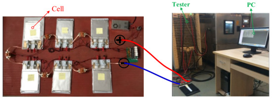 - Twenty cells were installed in the battery test bench. Since the battery test system could only install six cells at a time, we divided the above 20 cells into four groups, six cells in each group from the first to the third and two cells in the fourth. Series constant current discharge was carried out for each group.