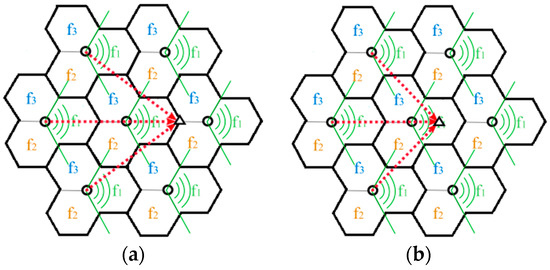 Let us describe in more detail the process of quantifying the maximum capacity of each user type. As the dotted line in Figure 1 shows, when only considering the first-tier interference, the user receives interference signals from three adjacent base stations because of the frequency reuse scheme. The maximum user capacity is calculated from the Shannon capacity [17].