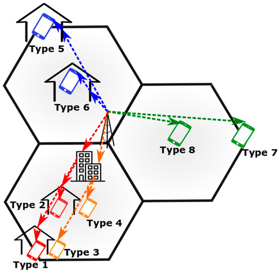 - For urban environments, eight types of users are considered under conditions of non-line-of-sight (NLoS) or line-of-sight (LoS), indoor or outdoor, and user location in the cell. The variation of signal propagation due to various factors is one of the main technological challenges in the spectrum management field [10]. It is also important to consider diverse user conditions, especially for indoor environments, where most data traffic is generated but users experience poor quality of service [11].