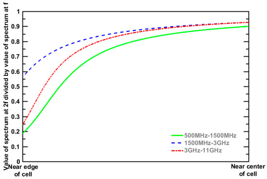 where Value (2f) is the spectrum value at 2f (higher frequency) and Value(f) is the spectrum value at f (lower frequency). Then this ratio can be calculated by choosing a frequency in the following three different frequency ranges, 500 MHz to 1.5 GHz, 1.5 GHz to 3 GHz, and 3 GHz to 11 GHz.