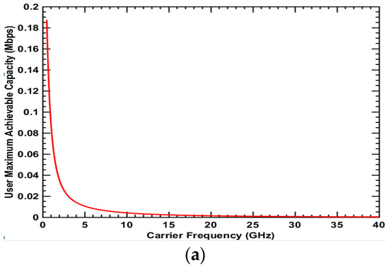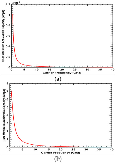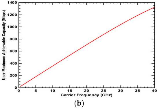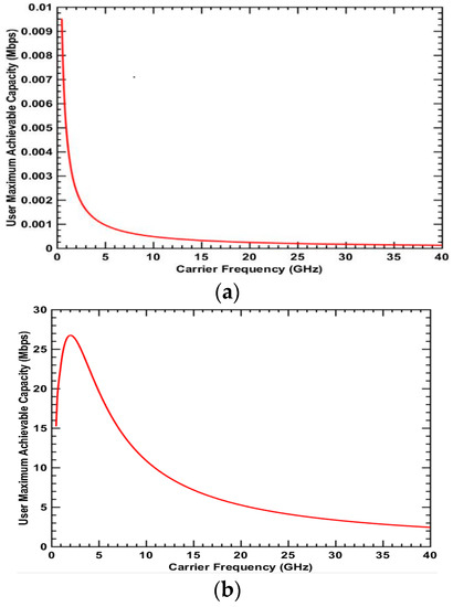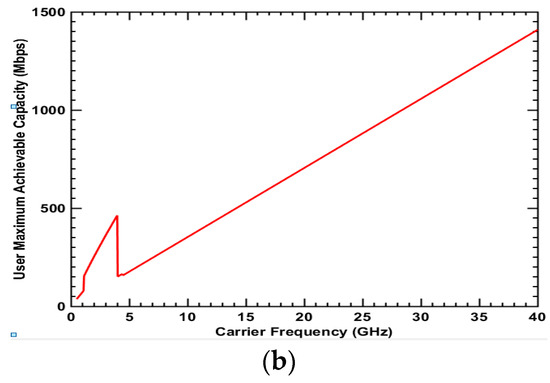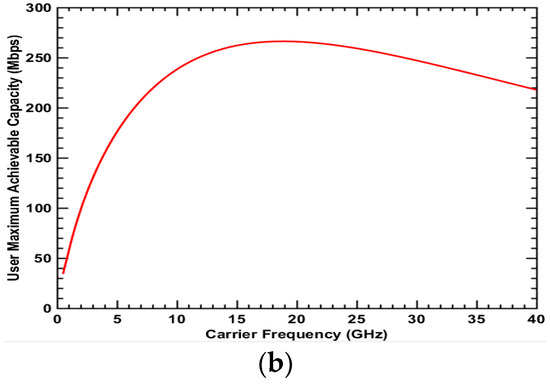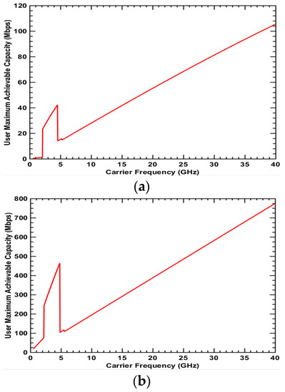 The maximum achievable capacity for eight different user types is estimated and presented in Figure 4, Figure 5, Figure 6, Figure 7, Figure 8, Figure 9, Figure 10 and Figure 11. Additionally, the carrier frequencies that maximize the achievable capacity for 3.5 GHz and 28 GHz are summarized in Table 5. Please note that 3.5 GHz and 28 GHz are considered 5G frequency bands in Korea.