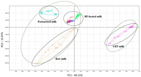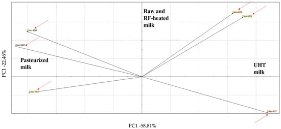 RF-heated milk is close to the “raw” samples, indicating a strong resemblance between the appearances of these two groups. On the other hand, pasteurized and UHT milks are far away, at the opposite sides of the scatter plot. Pasteurized milk is on the left, because of the high correlation with the colors (Figure 5).