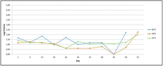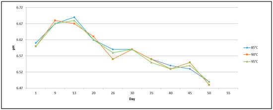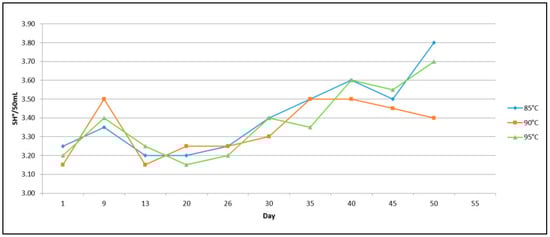 The measurements of pH, acidity, and TMC have been repeated during a storage period of 55 days in order to obtain detailed information regarding the shelf life of milk which was kept at 4 °C during the duration of the trial. Data acquired at 85, 90, and 95 °C have been used to obtain the following graphs (Figure 6, Figure 7 and Figure 8), which show the variation of the investigated parameters over time.