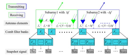 The transmit–receive system configuration of the FDA radar is shown in Figure 1. SB-FDA and FB-FDA are used as the transmitter and receiver, respectively, to decouple the beampatterns in range and angle domains. The whole array is divided into two equal-length subarrays to transmit waveforms with a pair of opposite frequency increments.