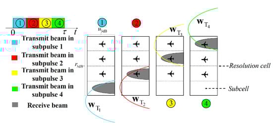 In such a system framework, we can transmit with a wide beam and recieve with a narrow beam. Motivated by the space–time coding technique [], intra-pulse beam scanning is proposed to improve the localization performance by suppressing sidelobe interference. The main benefit of space-time coding is total instantaneous angular coverage. Indeed, intra-pulse beam scanning a transmit–receive diversity method []. The main idea is that the pulse is divided into four subpulses, and the unresolved cell is divided into four subcells. During each subpulse, as shown in Figure 2, we steer transmit beam to focus on one or two subcells only.