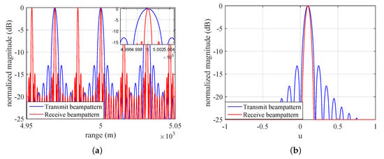 Since two subarrays with opposite frequency increments are equal-length, the S-shape beampatterns of subarrays are symmetrical. Note that the total transmit beampattern is the sum of two subarrays. Therefore, the range-periodic peaks only exist in the direction , namely, the transmit beampattern is range-angle-decoupled.