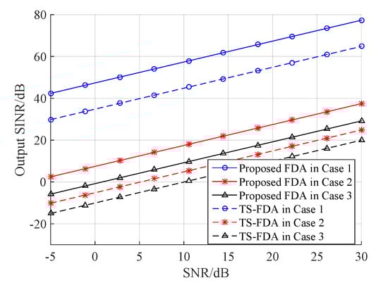 We also examine the output SINR of the proposed system versus SNR. Three cases of interference are set as shown in Table 2. Assume that the transmit and receive beams both focus on Target 1. Three interferences are separated from the target and their powers are equal. The interference locations of Case 1 and Case 2 are the same, but the interference power of Case 2 is much larger. Namely, Case 1 is noise-dominant and Case 2 is interference-dominant. We set the Interference 1 is located in the first sidelobe of receive beampattern in Case 3, which is interference-dominant. Figure 5 shows the output SINRs of the proposed FDA system and the transmit subaperturing FDA (TS-FDA) [] versus SNR in different cases. It is observed that the proposed system outperforms the TS-FDA in output SINR because all the return signals are received by using the FB-FDA. Note that the proposed system has an equivalent robustness against noise in the noise-dominant case. Furthermore, the range-dependent interference is suppressed in the interference-dominant case, and the output SINR is related to the interference location.