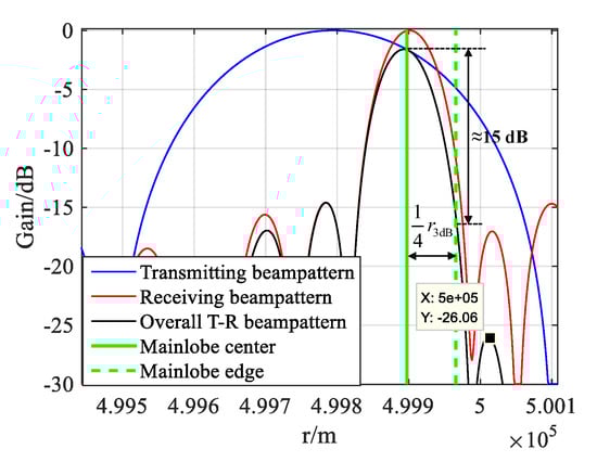 However, there are two constrains in frequency increment selection. One is that the range-periodic peaks of transmit and receive beampatterns should be staggered with other targets. The other one is that the transmit beamwidth in the range domain should be slightly larger than the range resolution of baseband signal. A too narrow transmit beam may lead to missed detection after match filtering [,,].