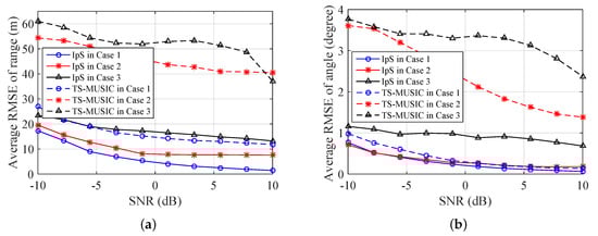 We examine the performance of intra-pulse beam scanning (IpS) and transmitting subaperture MUSIC (TS-MUSIC) [] for comparison. Average root mean square error (RMSE) results of 100 Monte Carlo simulations are shown in Figure 8. The results demonstrate that the performance of IsP is much better than TS-MUSIC since there is only one snapshot available. The spatial smoothing of TS-MUSIC leads to the loss of array aperture which is a disadvantage on the localization of unresolved targets. Note that the performance of TS-MUSIC gets worse rapidly in the cases of three targets, but IsP not. It means IsP is a robust approach of unresolved targets localization. However, the estimate error of IsP increases in Case 3 because two targets are located in the same subcell.