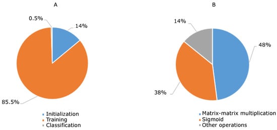 First, we developed a serial C implementation of the autoencoder described in the previous Section. This implementation serves as a baseline for the two newly developed parallel implementations. Moreover, it exploits the Advanced Vector Extensions 2 (AVX) instructions, in order to provide an optimized serial version. We choose to exploit multi-core and many-core architectures; in particular, for the first technology we adopted the OpenMP API, while for the latter we used the CUDA paradigm. The first solution has a lower parallelization effort when compared to the latter, but is not capable of achieving the same level of performance. Moreover, the serial implementation also allows us to perform a code profiling in order to identify the most time consuming operations. Profiling has been carried out using a real image with 300 × 300 pixels acquired over 33 bands. This image is smaller than the images that we used for testing our frameworks. However, even with an hyperspectral image of reduced sizes it is possible to notice how the computational weight is distributed among the different tasks. Those proportions are similar on bigger images. The training has been performed on a sub-image of suitable size. Therefore, the reconstruction needed for the training considers, as input, a sub-image stored as a matrix. This profiling highlights that the initialization and the selection of the training set took about 14% of the total processing time, while the training phase accounts for the 85.5%, and the rest is related to classification. Moreover, if we analyze only the training phase, 48% of the time is needed for matrix multiplication, while 38% is needed for the sigmoid function and the remaining 14% is needed for the other operations, such as memory allocations, random numbers generation and data normalization. This is shown in Figure 2.