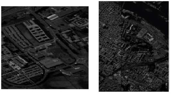The proposed frameworks have been tested with two real images. The first, which will be referred to hereinafter as PaviaU, is an image acquired over the University Campus of Pavia. The image is made up of 610 × 340 pixels acquired over 103 bands. The second one, that will be referred to hereinafter as PaviaC, is acquired over the city center of Pavia. It is made up of 1096 × 715 pixels acquired over 102 bands. A significative band among those present in the two images is shown, in black and white, in Figure 4. In the cases, we performed four different tests, with training sets corresponding to 1%, 10%, 30% and 50% of the pixels in the image.