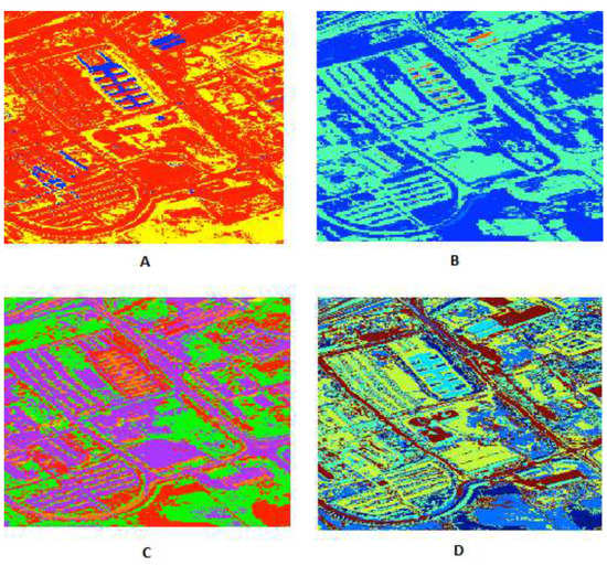 The classification of PaviaU image considering as training the 1% (A), the 10% (B), the 30% (C) and the 50% (D) of the image.