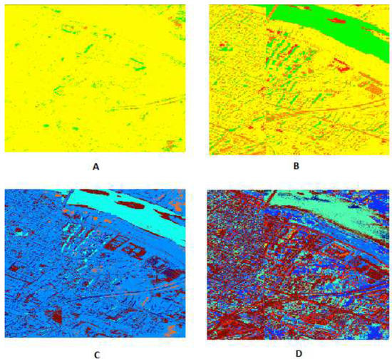 The classification of PaviaC image considering as training 1% (A), the 10% (B), the 30% (C) and the 50% (D) of the pixels in the image.