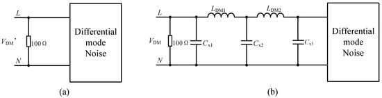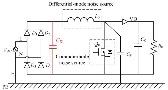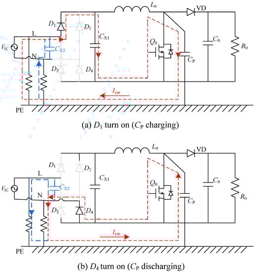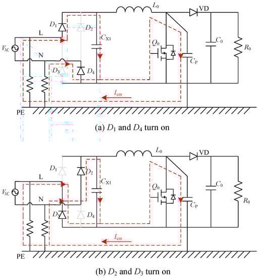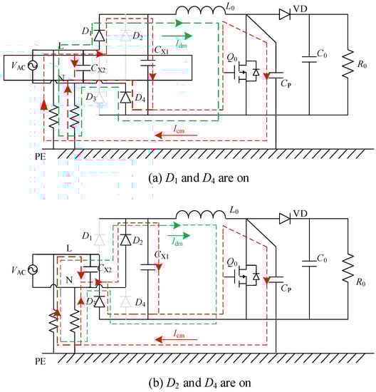 When the rectifier bridge is on, due to the DM capacitance CX1, the CM current from the chassis almost meets the equivalent impedance. At this time, the CM noise almost equally flows into the L and N lines, where we avoid the CM interference transformation position difference caused by the line impedance unbalance. As shown in Figure 2, the diodes in grey do not conduct. When the input voltage is positive, D1 and D4 conduct; however, the noise reversely flows through diode D4 because the alternating current (AC) power grid voltage makes the diode conduct. In the negative half-cycle, D2 and D3 will conduct, and a similar analysis can be performed. The addition of CX1 will result in harmonics of the input current and needs to ensure that the frequency is higher than 150 kHz. A CX1 capacity resistance that is much less than 50 Ω can effectively suppress the mixed interference (the DM interference in part from the CM interference).
