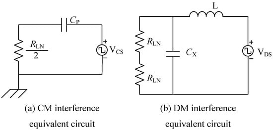 Figure 5 shows the CM and DM equivalent circuit of the boost PFC converter. According to Figure 4, the filter capacitors CX1 and CX2 are parallel. Make CX = CX1 + CX2. In the CM interference branch, CX is connected in series with the test resistor RLN on the branch. When the impedance of CX is smaller than the test resistance RLN, it can be considered that the filter capacitor CX is short-circuited, and the test resistance of the L and N lines is equivalent to the parallel connection. Therefore, the test resistance on the CM interference equivalent circuit is RLN/2, and its CM interference voltage is VCM. The CM interference equivalent circuit is shown in Figure 5a. The transmission gain |TGCM(f)| of the CM voltage is derived as below.