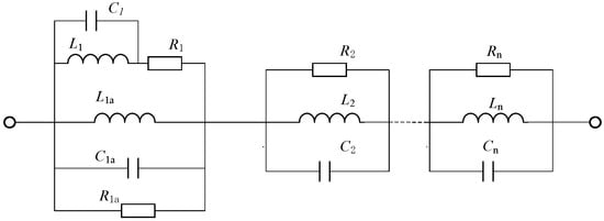 The CM model is more complex, and because of the nonlinearity of the magnetic element, the parameters of the common-mode equivalent model vary with the frequency [19,20,21]. Based on these reasons, a more complex model was used to characterize the high-frequency modeling of CM inductors. The improved model, shown in Figure 6, was based on the traditional Foster model [22]. The first level mainly consisted of the core characteristics (influence of iron core, layer number, and turn number), the second level determined the position and amplitude of the second resonant peak, and the third level determined the phase frequency characteristics before and after the second resonance peak, in which stray capacitance C1 is mainly related to the lead length of the common-mode inductor. The n-order Foster model can be expressed by n-harmonic peaks.