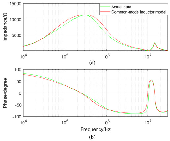 In order to verify the feasibility of the model, an impedance analyzer was used to test the CM inductance sample, and the scanning frequency range was 150 kHz to 30 MHz. Figure 7 shows the comparison results, fitted using MATLAB.
