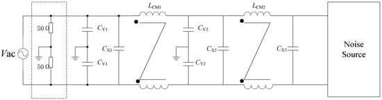 The EMI filter’s attenuation of conducted EMI can be expressed as the voltage insertion gain. The voltage insertion gain is defined as the ratio of the interference voltage measured before and after adding the EMI filter. Similarly, CM and DM equivalent circuits of the EMI filter need to be established, and then the CM and DM attenuation effects of the filter are considered, respectively. The filtering effect of EMI filters is not only related to its own parameters, but is also closely related to interference source impedance. Therefore, in order to design EMI filters efficiently, it is necessary to choose an appropriate filter topology according to different impedance characteristics. In medium and high power of the converters, due to strong common-mode interference, two-stage EMI filters are usually used to suppress interference. In general, the leakage inductance of a CM inductor is used as a DM inductor when designing an EMI filter. Figure 8 shows the two-stage EMI filter topology. In Figure 8, CY1 and CY2 are CM capacitors and their values are equal, CX1–CX3 are DM capacitors, and LCM1 and LCM2 are CM inductors.
