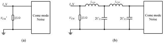 Scholars from various countries conducted extensive research on the reliability of converter devices and their power devices [4,5,6]. Power converters usually consist of switching devices, storage devices, driving devices, and signal processing and control circuits. The reliability of the converter is determined comprehensively by the reliability of each part. All kinds of capacitive elements, especially aluminum electrolytic capacitors, are key factors which affect the reliability of power converters. However, research shows that the power switching device is the most likely part to lose efficacy among the components of the converter. As the most fragile component of the power electronic switching device, the reliability of the power switching device determines the reliability of the entire device to some extent. Studying the reliability of power devices is the basis for improving the reliability of power converters [7]. The discussion of reliability in this paper is based on the influence and suppression of the interference caused by power converters in actual operation. When the device is operated beyond the rated voltage or current range, it may cause excessive electrical stress and damage to the power device [8,9]. Under excessive electrical stress, part of the device will locally overheat. When the hot-spot temperature reaches the melting point of the material, the material will melt, causing damage to the device. When the circuit interference is relatively strong, the disturbance will form a strong inrush current through the parasitic parameters in the circuit, which will cause the power device (diode, rectifier bridge, metal-oxide-semiconductor field-effect transistor (MOSFET), etc.) to be damaged. The power switching device has a high current voltage, which causes great switching loss and strong interference. The rapidly changing dI/dt and dV/dt of the power device causes a strong interference current through the parasitic parameters in the circuit, which influences the reliability and stability of the power converter [10]. The interference current caused by the power device is mainly the common-mode (CM) current, which is the conduction interference in the converter. This can be suppressed by an electromagnetic interference (EMI) filter. Therefore, the conduction interference in the circuit of the power converter needs to be analyzed and suppressed in order to improve its reliability and stability.