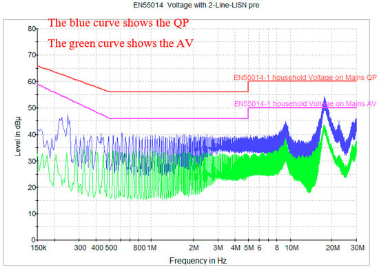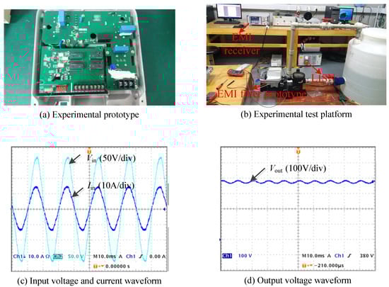 Based on the above analysis, the EMI filter was designed, and the boost PFC converter was optimized. The experimental platform of a 2.4-kW boost PFC motor was built, and the experimental prototype is shown in Figure 12a. Figure 12b is the experimental EMI test platform. Figure 12c shows the input voltage and input current waveforms of the boost PFC converter system. Figure 12d shows the output voltage waveforms. Figure 13 shows the EMI conduction test results of the experimental prototype. Clearly, as shown in Figure 13, the 2.4-kW boost PFC test platform could successfully pass the EMI test. The power factor (PF) of the prototype was very high, and the system could run stably for a long time, thus ensuring the security, reliability, and stability of the system.