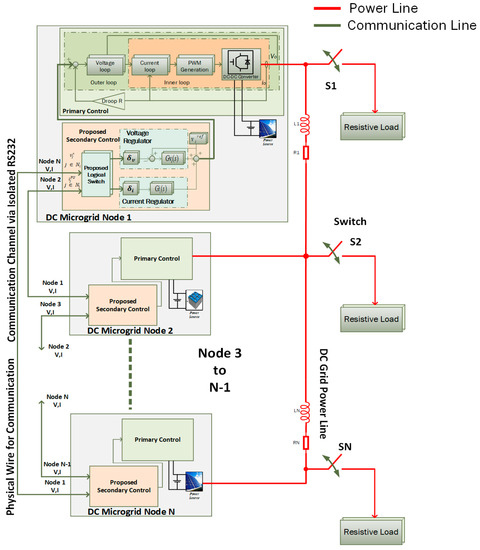 The inclusion of RES-based DC microgrids at the distribution level appeals more to system designers due to a greater penetration of electric vehicles and energy storage units. Furthermore, the microgrids provide simpler control methods for operation, where most consumer loads are fundamentally drawing DC current at the consumer level [7,8]. Connecting large-scale RES-based DC microgrids needs a control scheme for achieving the required operation. The control of RES-based DC microgrids requires centralized, decentralized, and distributed control schemes for hierarchical control. Hierarchical control is composed of primary, secondary, and tertiary level controls [8,9,10]. For primary control, every node uses a localized droop mechanism that strives to achieve the required load sharing by varying the droop virtual resistance to keep the dynamics of the system stable individually [11,12,13]. Therefore, for integration on a large scale, every node must follow common reference set points that have been set by higher-level controls. Alternatively, the node can work only on a droop mechanism locally. Secondary controls form the outer loop on top of the primary control. At the secondary level, all the nodes share the values with their neighbors to observe and converge the system to one common set point for the system to remain stable and balanced [14,15,16]. Secondary and tertiary controls are implemented in a centralized or decentralized fashion where they communicate with their neighbors through communication links. Any failure or uncertainty in the link can lead the individual systems to cause instability and failure of the node which will stress all the other healthy nodes of the system, leading possibly to a cascaded failure [17,18,19]. Since this adds complexity to the system with respect to centralized control and scalability, distributed control schemes are therefore an attractive option for providing more reliability with a simpler communication network topology, thereby reducing the cost [20,21,22]. Secondary control updates the set point at every distributed energy resource with neighbors in a low bandwidth communication network. Algorithms for system stability and robustness against uncertainty were used by using graph theory and matrix theory techniques [17,23]. RES-based DC microgrid communication systems have problems with communication delay due to the time it takes to exchange information with neighbors. These delays affect the system stability and response to load imbalances. The system should respond in time to adjust the set points for every node [18,24,25]. In a bi-directional communication network, when the communication channel transmits a large volume of data, errors in communication may occur and this may affect the system performance [26,27]. Due to the renewable energy-based distributed generation units (DGU) with intermittent nature, microgrids require faster controls [28,29]. In an intermittent system, communication link failure can make nodes over-stressed because of a mismatch in operating reference. Over-stressed nodes may lead the network to instability and cascaded failure. Previously, authors have implemented a simple approach to stabilize a system by disconnecting the secondary control in the case of communication link failure and shifting the system to constant reference. The main drawback in constant reference is that every node has a constant reference which may be different. This constant reference approach is also limited to ring-connected control [30,31]. However, for higher communication reliability, more complex communication networks are normally used in practical systems. This paper proposes a new algorithm to effectively detect communication islanding and maintain system stability while maximizing the performance for more complex networks. The noteworthy contributions of this proposed algorithm are the following: