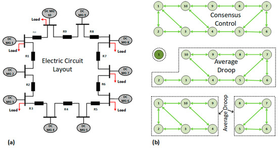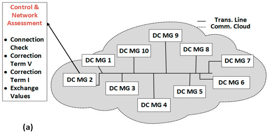 System diagram: (a) connection of ten-node DC MG; (b) communication scenarios.