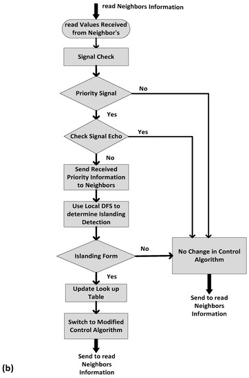 A multi-agent consensus-based algorithm works with multiple participating nodes, as is shown in Figure 1. Every node consists of a renewable energy-based source, which uses primary control and secondary consensus-based control, in addition to the network status layer. In the proposed structure, the islanding detection algorithm was added with a consensus to detect and observe the connectivity of the di-graph, using the information exchange between neighbors. Every node generates a look-up table of a connected graph, based on the information exchange between neighbors. There are two kinds of information—regular information and priority signals. Regular information is exchanged among nodes, and priority signals are generated only in the case of communication link failure. These signals are used to update the look-up table for the connected network and to look for consequences. If any link failure occurs, these disconnected nodes will then generate a priority signal and send it to immediate neighbors and share onwards. Every node checks for a priority signal to re-evaluate the look-up table of connectivity and generates a new connected graph table using that information. It detects a link failure in time to take corrective measures, by searching through the look-up table [30,31,32,33].
