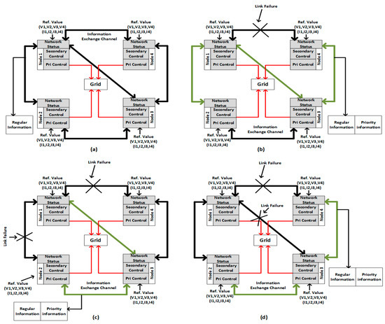 - After detecting communication link failure, the proposed algorithm modifies the control to maintain operation and stability. In this manner, every node can act quickly to maintain the network variables for a reliable operation and control.