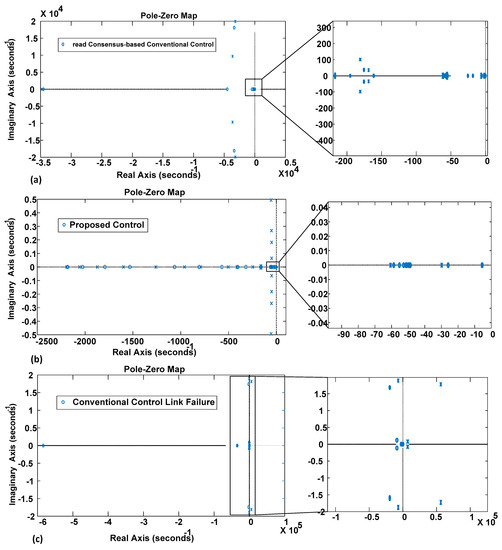 Pole-zero stability plot: (a) consensus-based conventional control; (b) proposed control; (c) conventional control link failure.